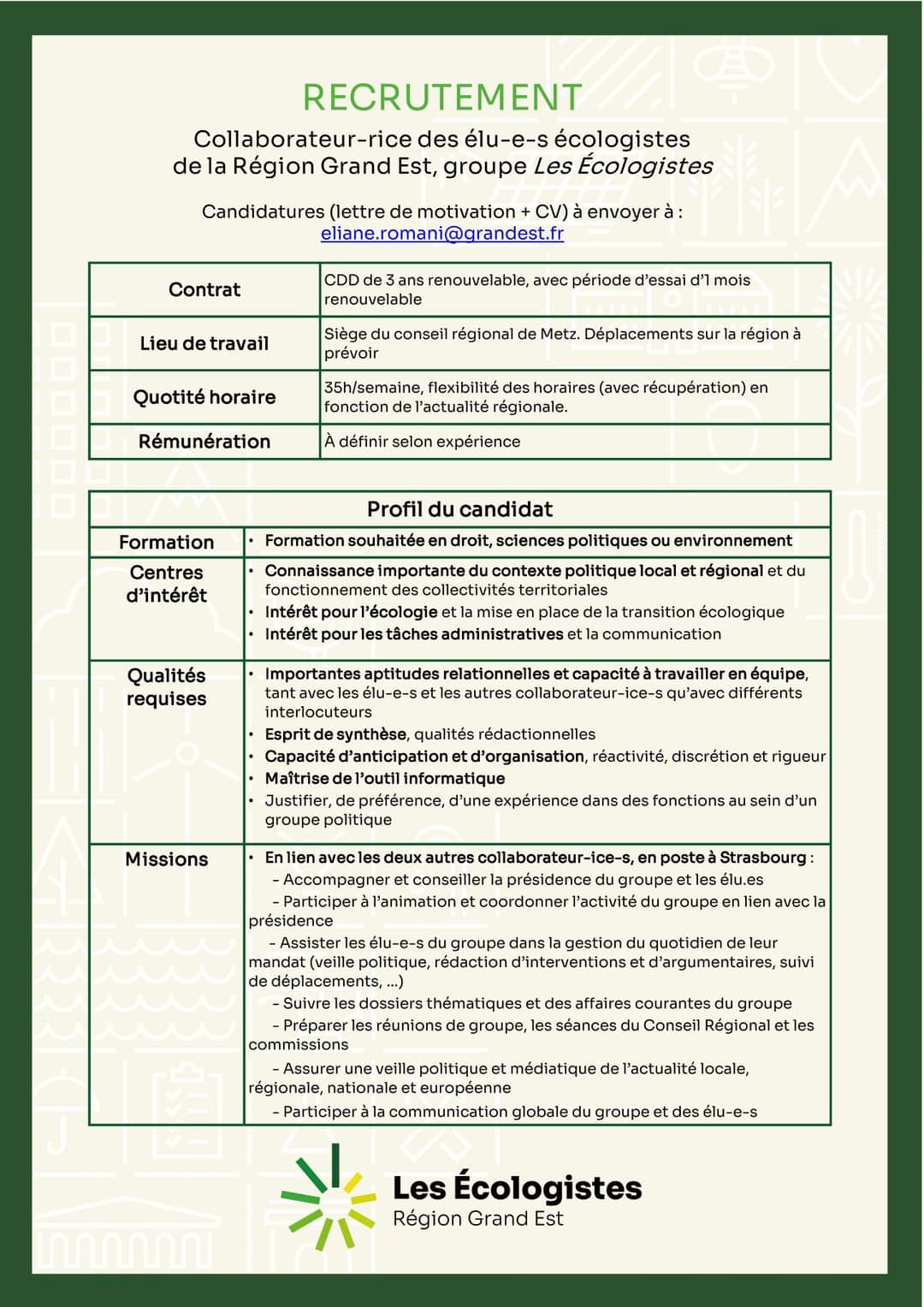 Le groupe des écologistes au Conseil régional Grand Est recherche son collaborateur/trice. L’offre est en pièce jointe.